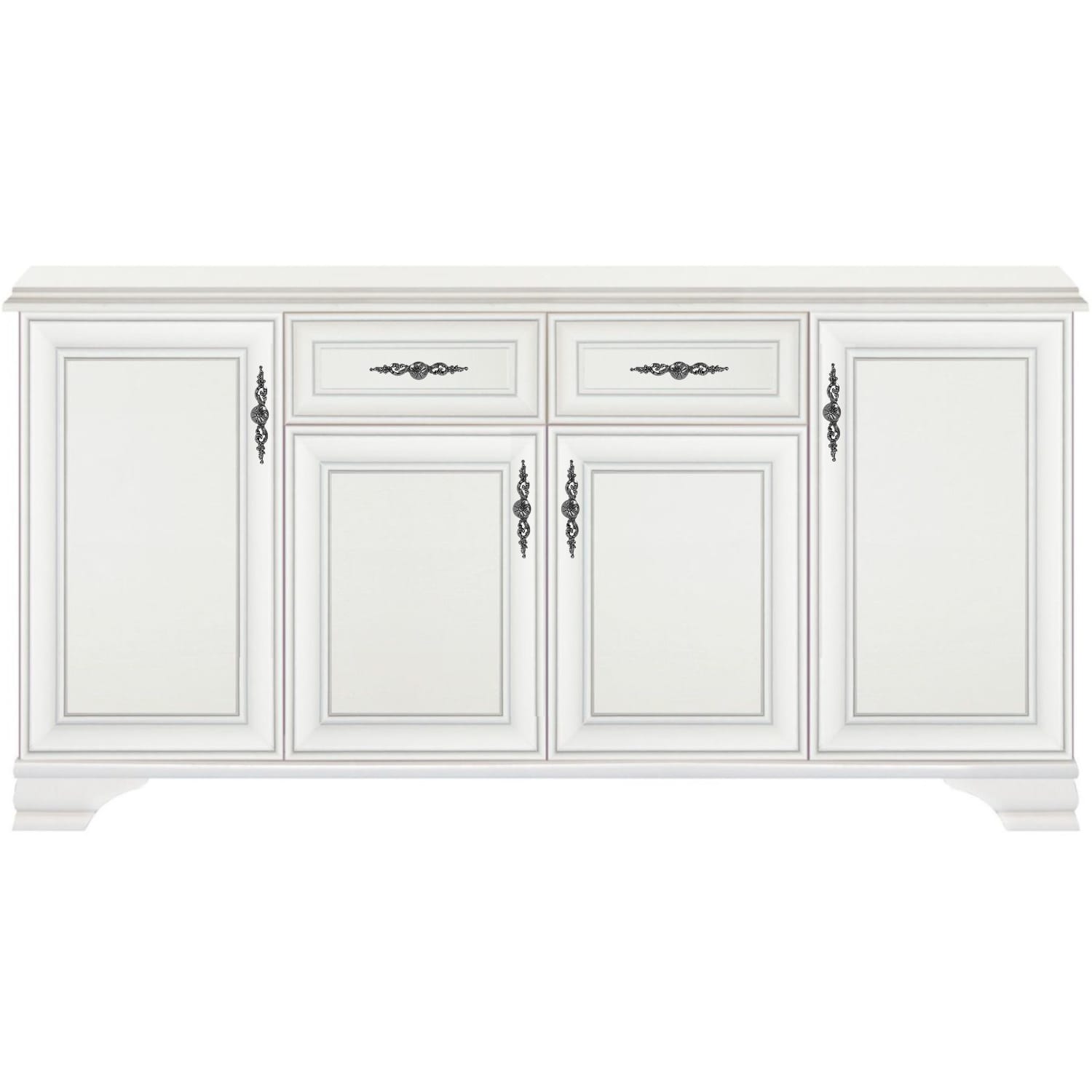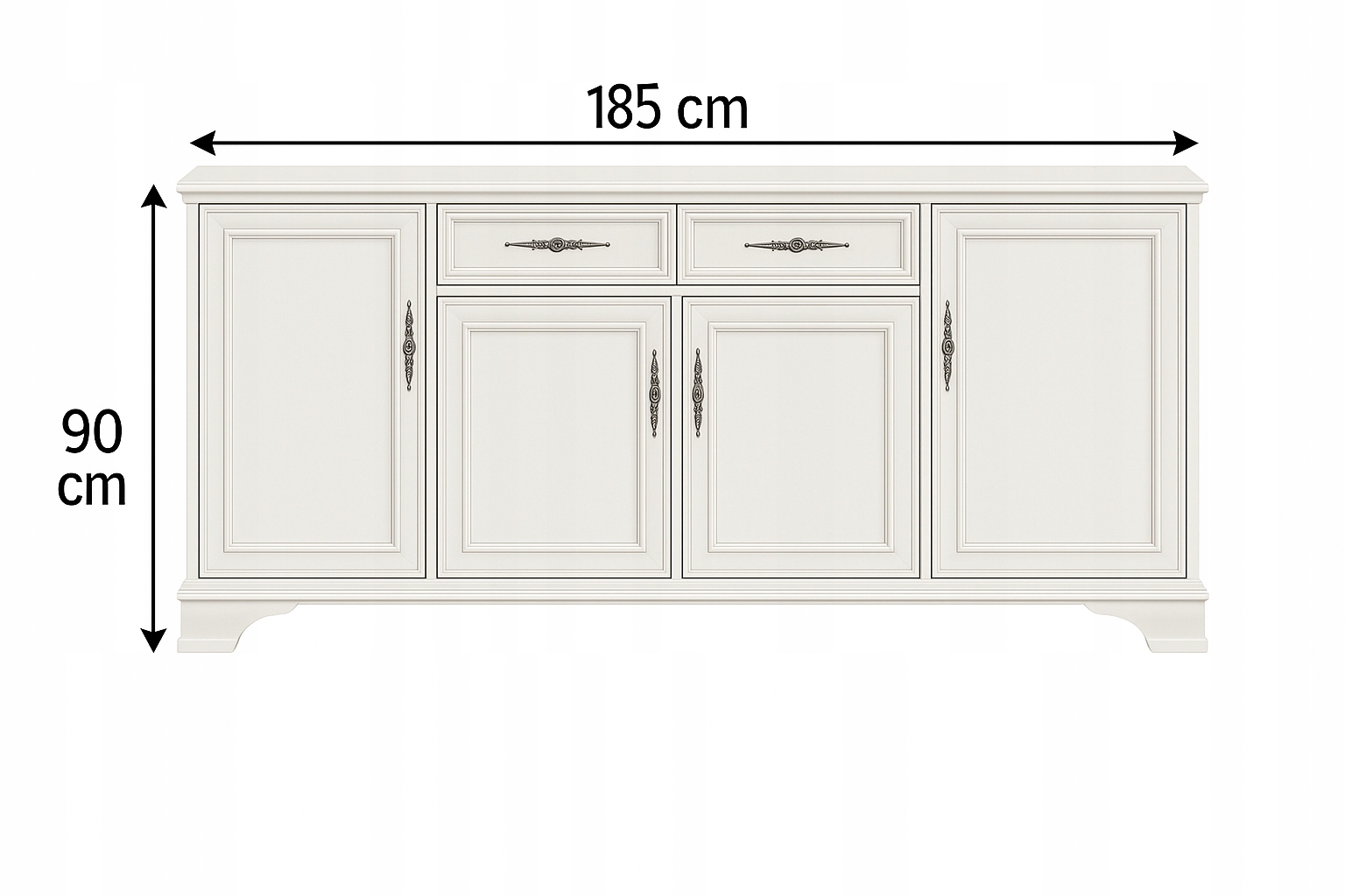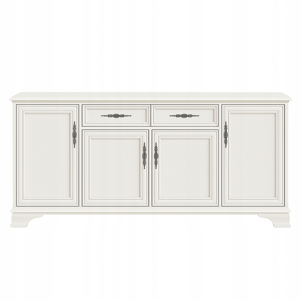 🔹 Praktyczność połączona z Estetyką: Dwie szuflady oraz cztery drzwi gwarantują dużo miejsca do przechowywania, a ich metalowe uchwyty dodają komodzie elegancji.
