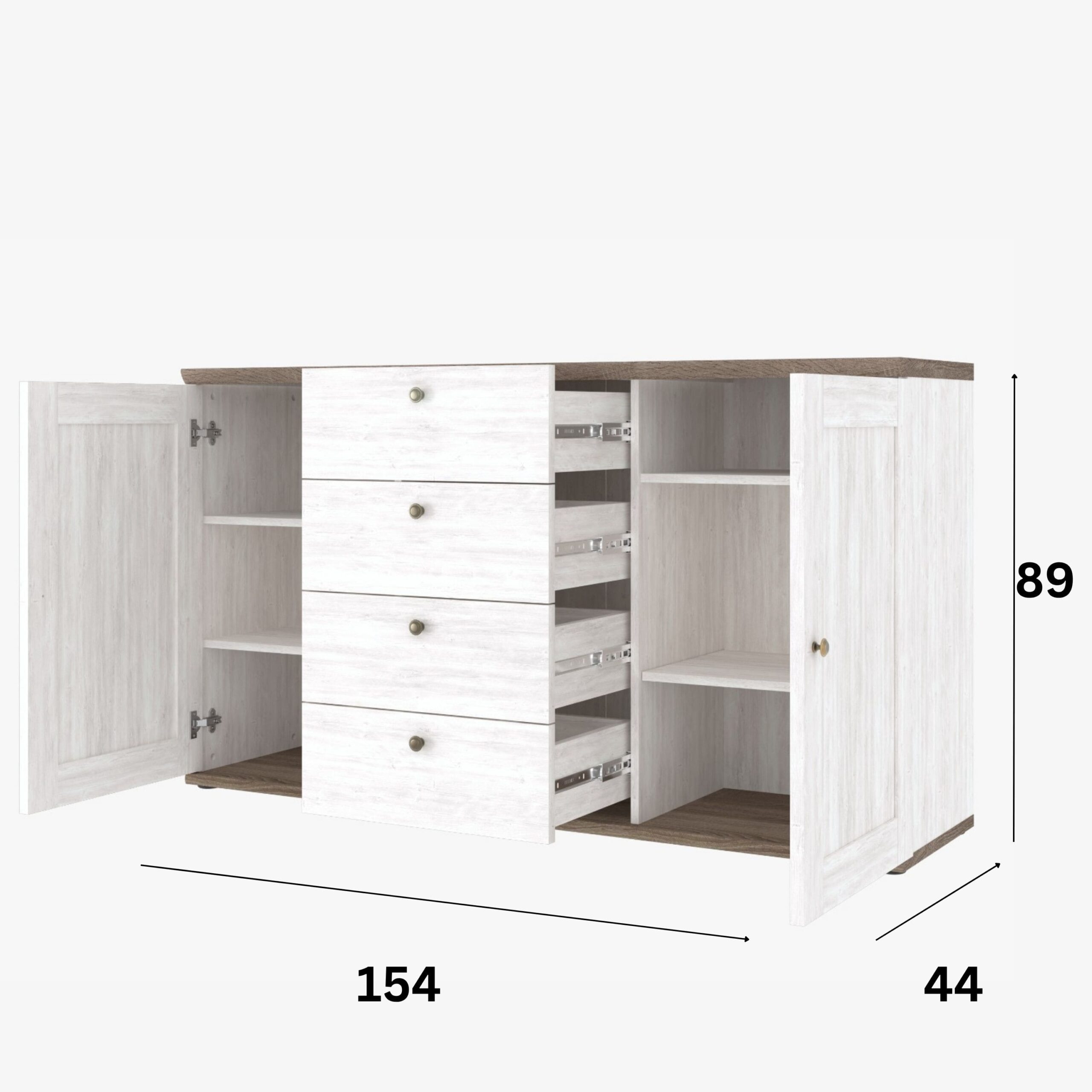 Wnętrze komody skrywa dwie funkcjonalne półki i dwie pojemne szuflady, które pozwalają na wygodne rozmieszczenie najważniejszych przedmiotów. Prosta forma, staranne wykończenie i wyważone proporcje czynią z tego mebla integralny element współczesnych aranżacji.