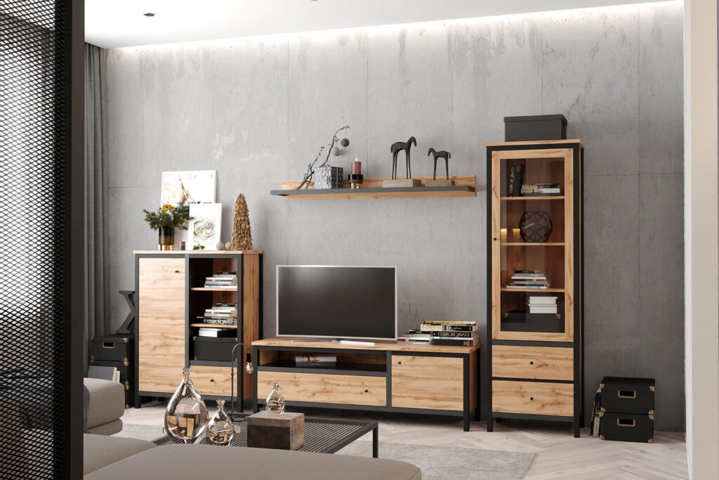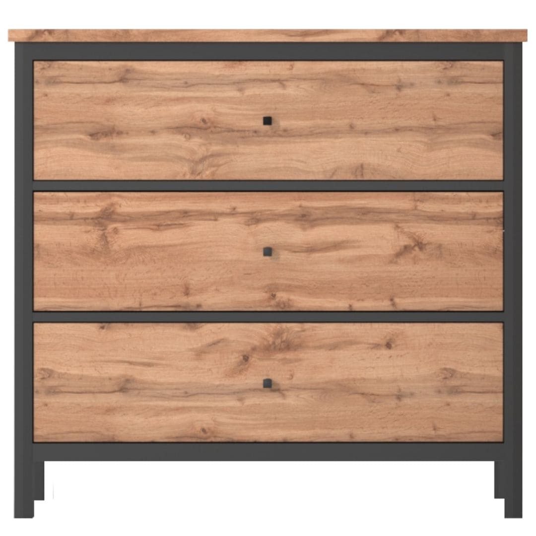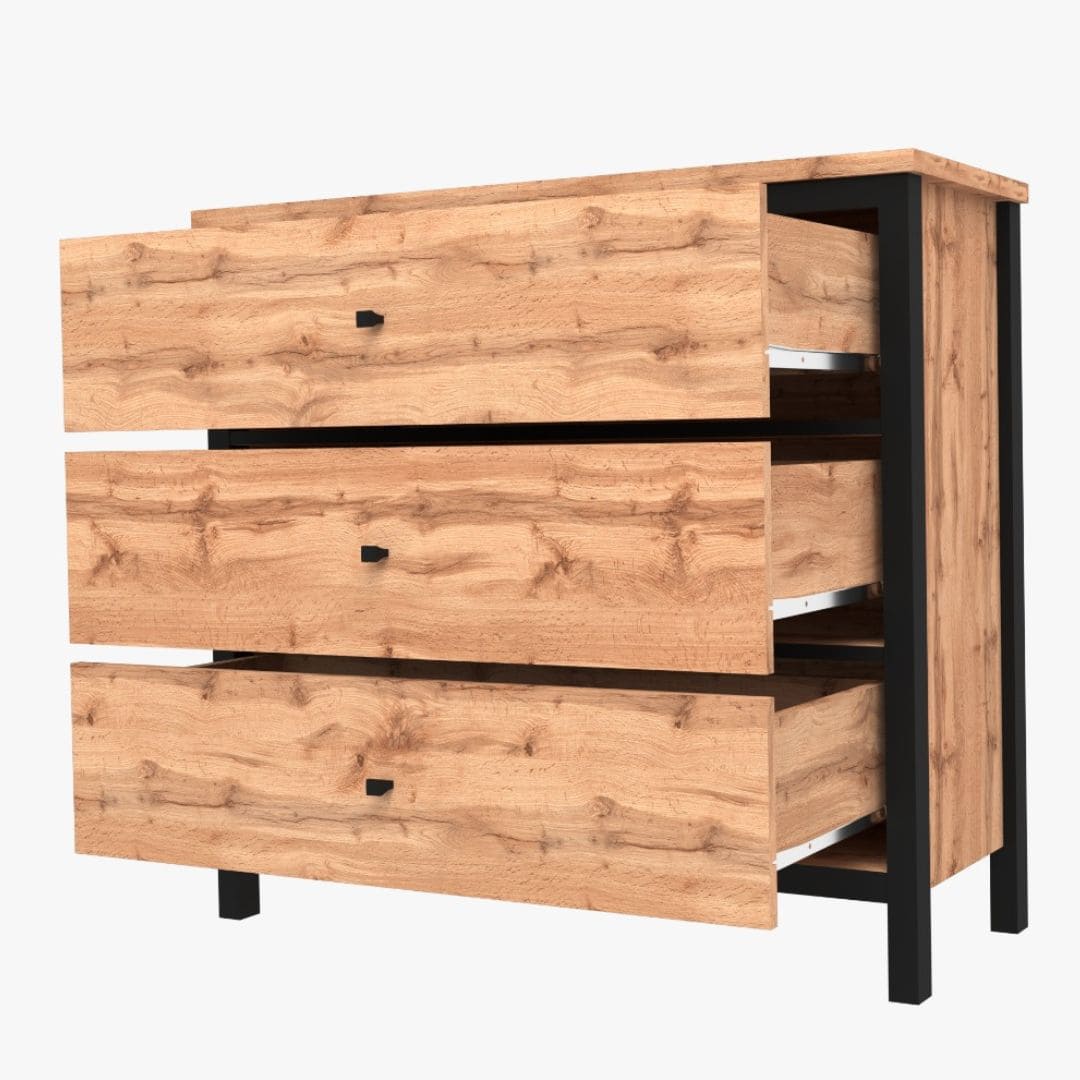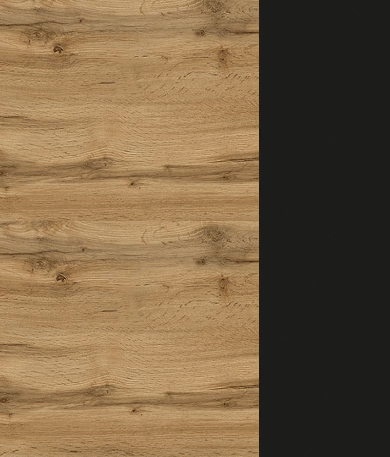 Loftowa komoda CHOS z trzema pojemnymi szufladami to mebel, który zadba o harmonię w Twoim wnętrzu – niezależnie, czy ustawisz ją w salonie, sypialni, czy przedpokoju. Ciepły odcień dębu tacho pięknie współgra z czernymi wstawkami, tworząc nowoczesny, ale przytulny efekt. Schowasz tu wszystko, co nie powinno być na widoku – od dokumentów po ubrania. Mebel przyciąga wzrok prostotą formy i subtelnymi, geometrycznymi detalami.
