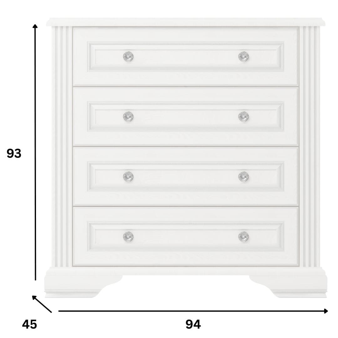 Kolekcja WINDSOR została stworzona z myślą o tych, którzy chcą łączyć funkcjonalność z ponadczasowym pięknem. Komoda z czterema szufladami jest tego najlepszym dowodem – praktyczna, elegancka i trwała, zachęca, by uczynić ją częścią codzienności.
