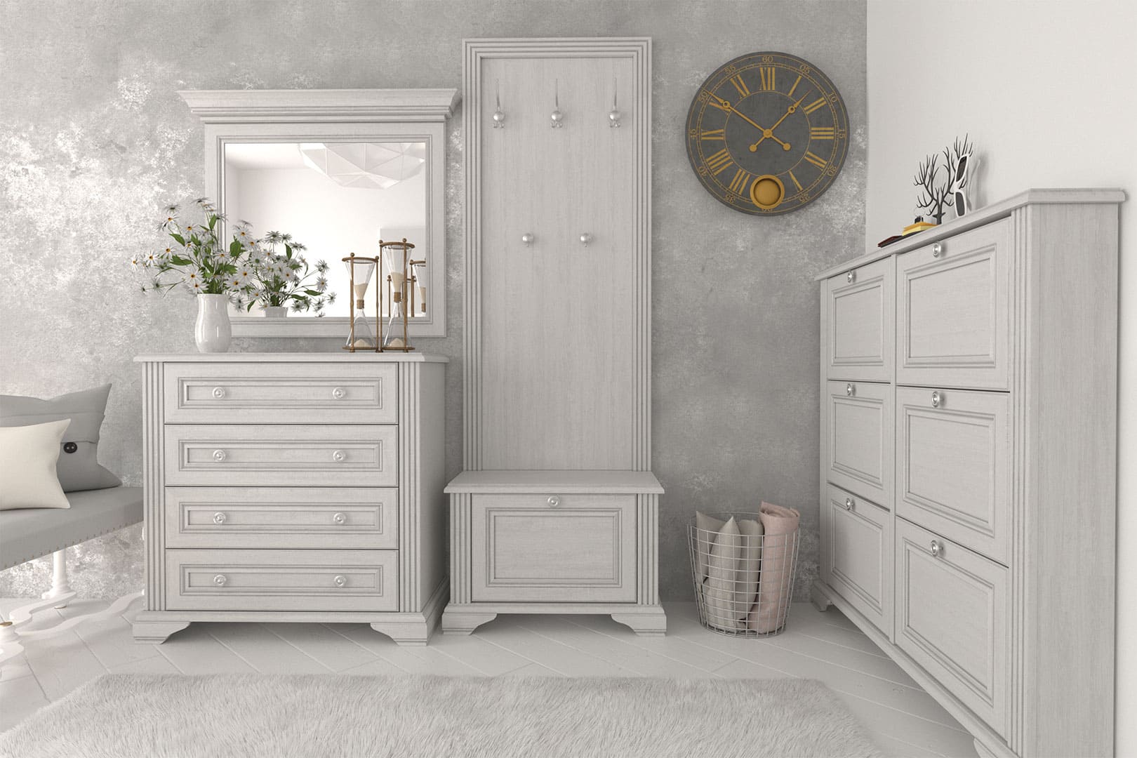 Komoda WINDSOR w wersji z czterema szufladami to mebel, który łączy w sobie klasyczny szyk i współczesną funkcjonalność. Smukła forma, zdobiona pionowymi frezowaniami i subtelnymi listwami, wprowadza do wnętrza wrażenie porządku i harmonii. Każdy element został zaprojektowany tak, by współgrać z całością kolekcji — od dekoru w tonacji sosny śnieżnej z akcentem popielu, po eleganckie uchwyty w srebrnym odcieniu.