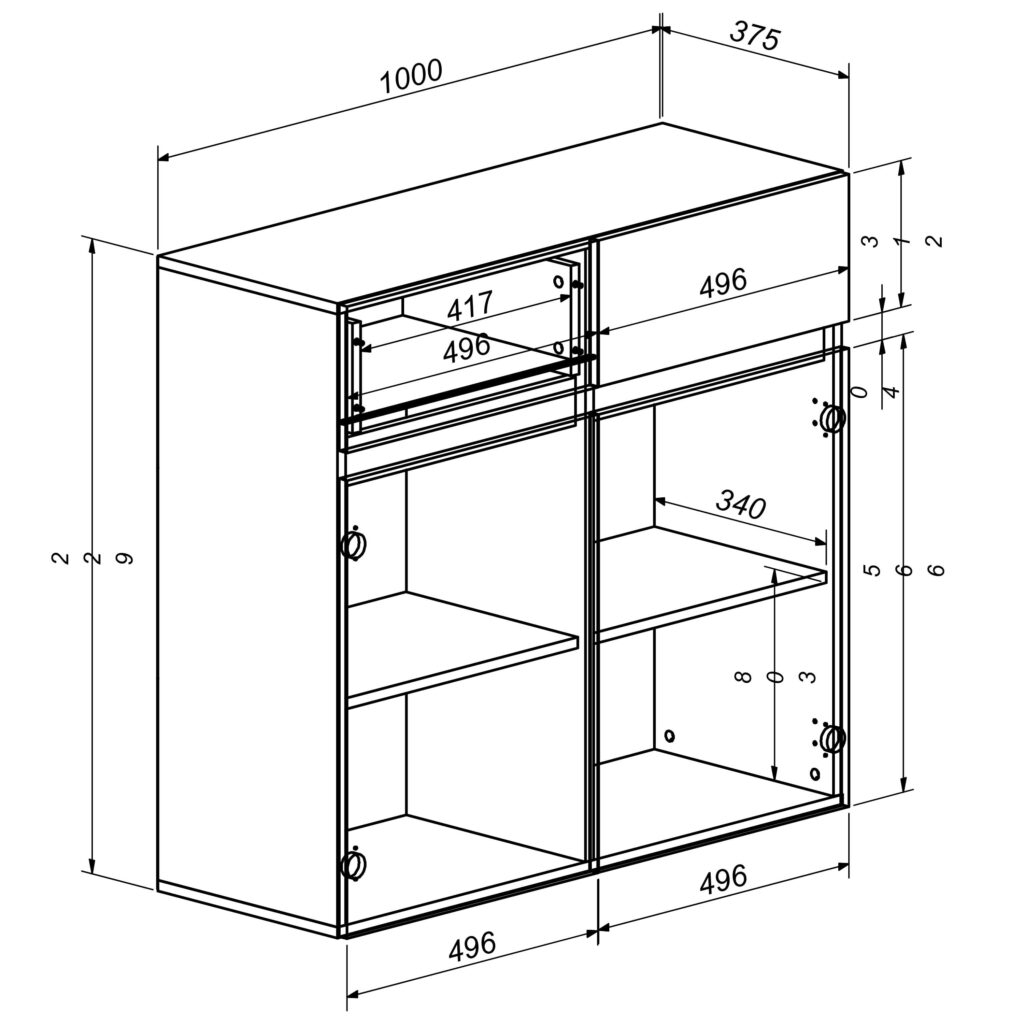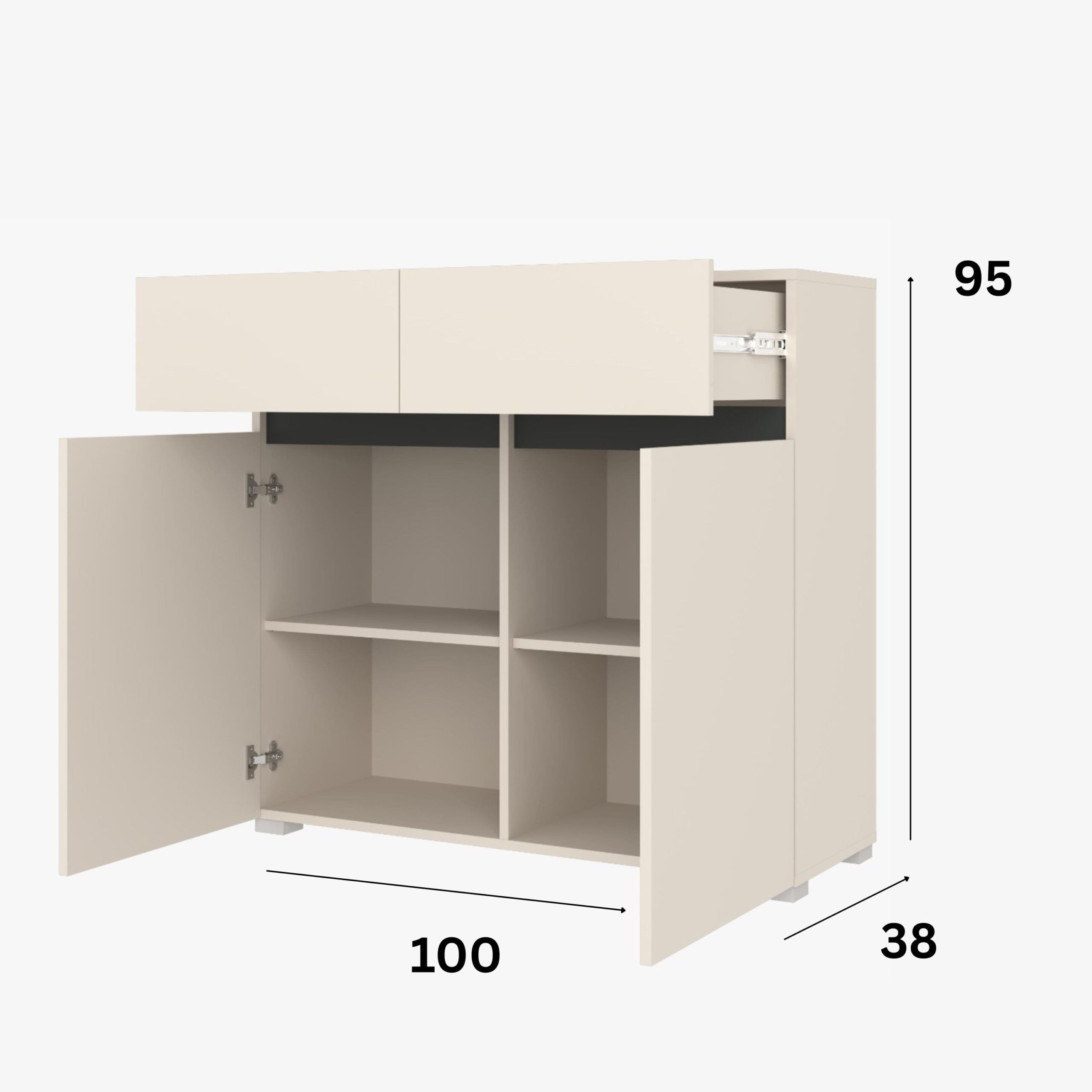 Wnętrze komody skrywa dwie funkcjonalne półki i dwie pojemne szuflady, które pozwalają na wygodne rozmieszczenie najważniejszych przedmiotów. Prosta forma, staranne wykończenie i wyważone proporcje czynią z tego mebla integralny element współczesnych aranżacji.
