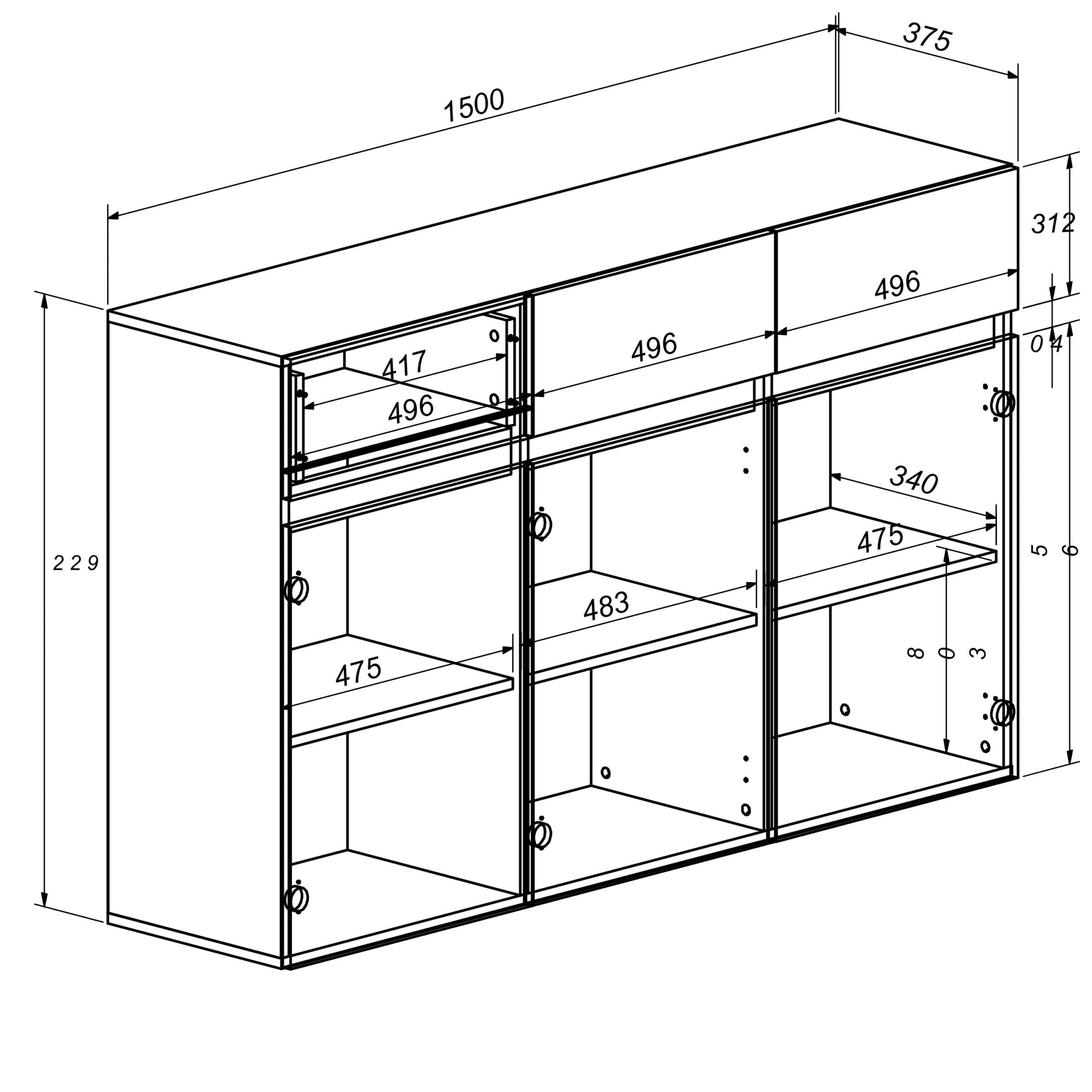 Wnętrze komody skrywa trzy funkcjonalne półki i trzy pojemne szuflady, które pozwalają na wygodne rozmieszczenie najważniejszych przedmiotów. Prosta forma, staranne wykończenie i wyważone proporcje czynią z tego mebla integralny element współczesnych aranżacji.