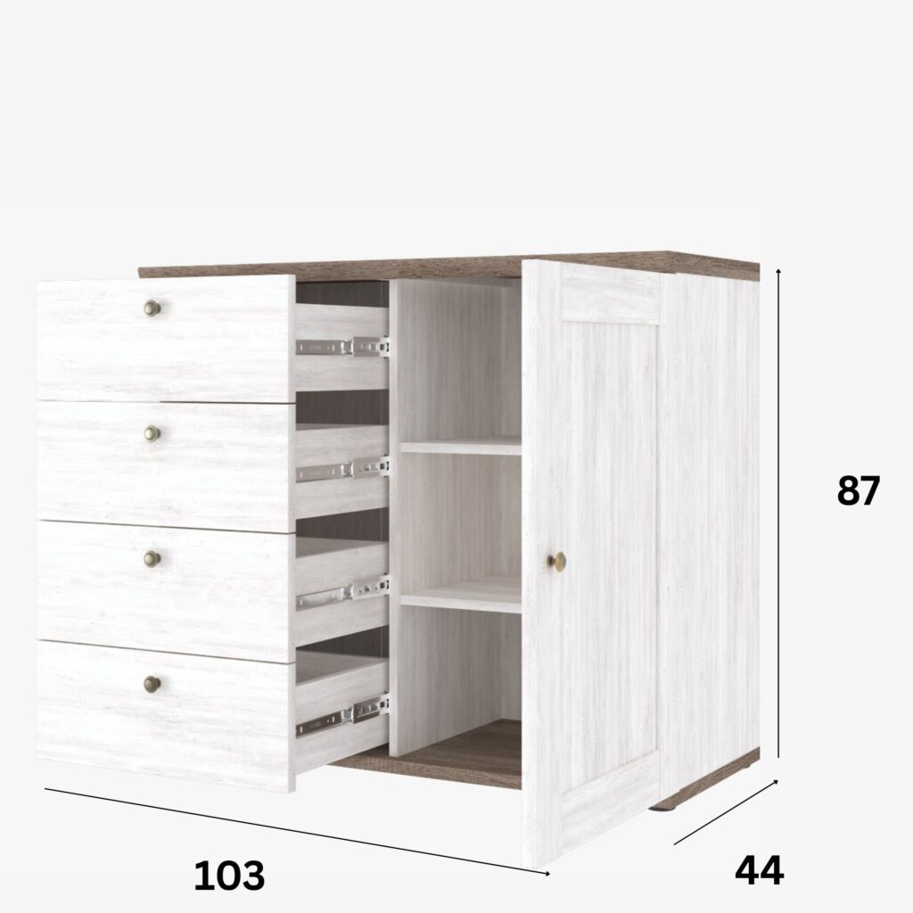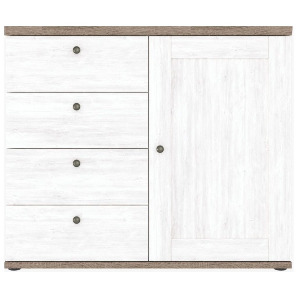Komody BERGEN to połączenie funkcjonalności z estetyką. Jasne fronty w kolorze sosny kanionowej i blaty w odcieniu dębu truflowego tworzą ponadczasowy duet, który ociepla każde wnętrze. Frezowane detale i metalowe uchwyty dodają całości subtelnego charakteru.