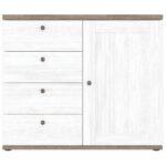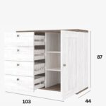 Wnętrze komody skrywa dwie funkcjonalne półki i cztery pojemne szuflady, które pozwalają na wygodne rozmieszczenie najważniejszych przedmiotów. Prosta forma, staranne wykończenie i wyważone proporcje czynią z tego mebla integralny element współczesnych aranżacji.