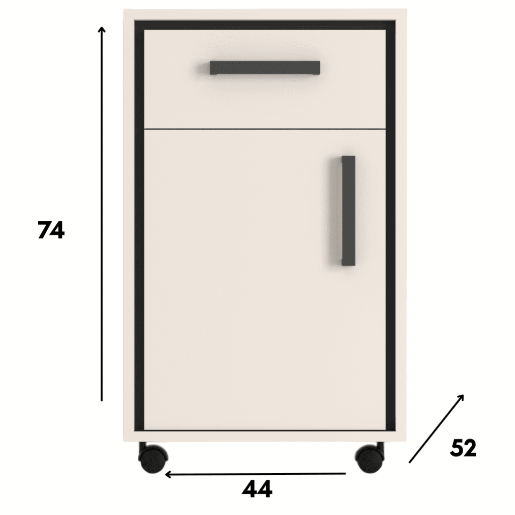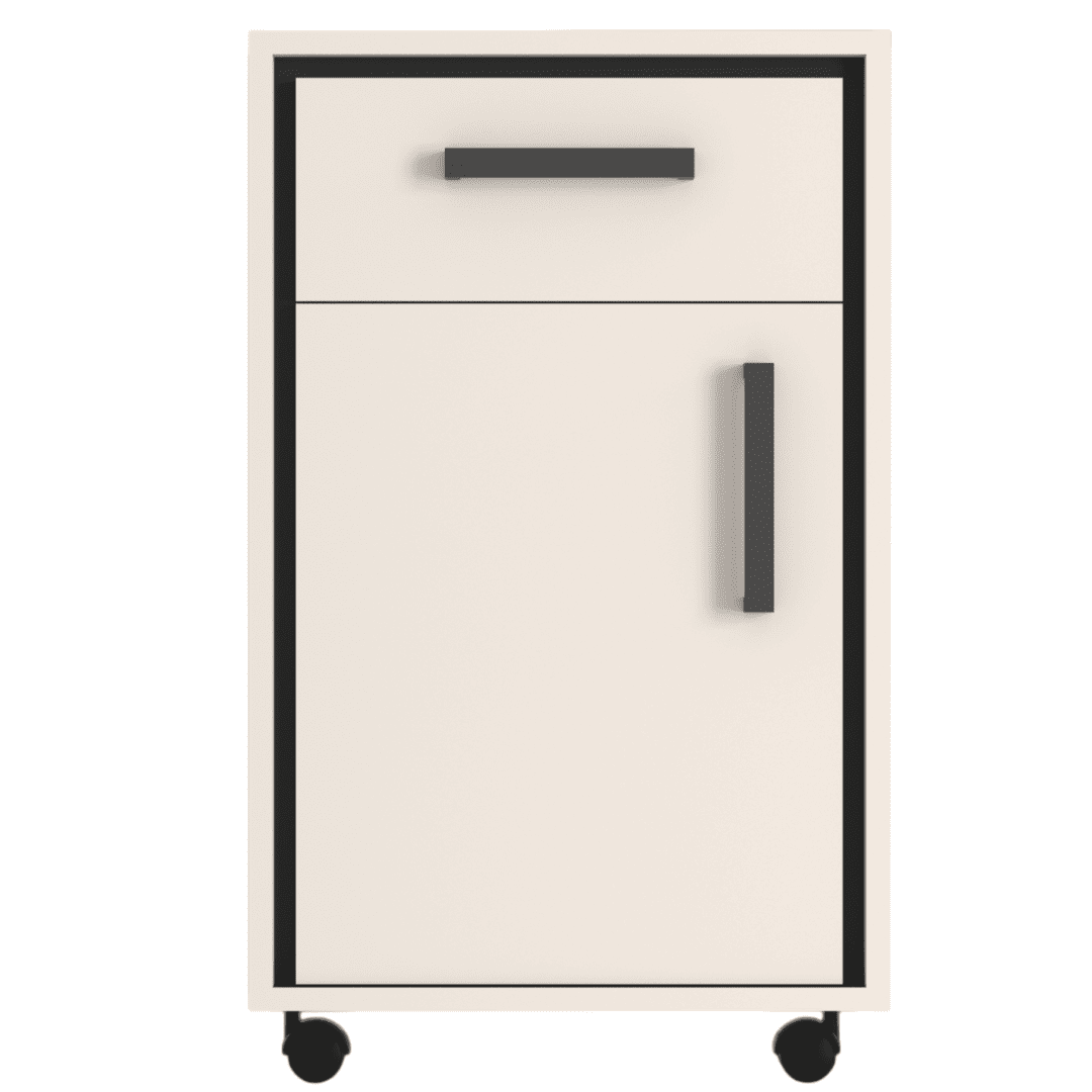 Kompaktowy kontenerek na kółkach w matowym wykończeniu (połączenie czerni i kaszmiru) to funkcjonalny i stylowy element wyposażenia biura lub domowego gabinetu. Wyposażony w praktyczną szufladę oraz otwartą półkę, pozwala na wygodne przechowywanie dokumentów, materiałów biurowych czy codziennych drobiazgów, które warto mieć zawsze pod ręką.