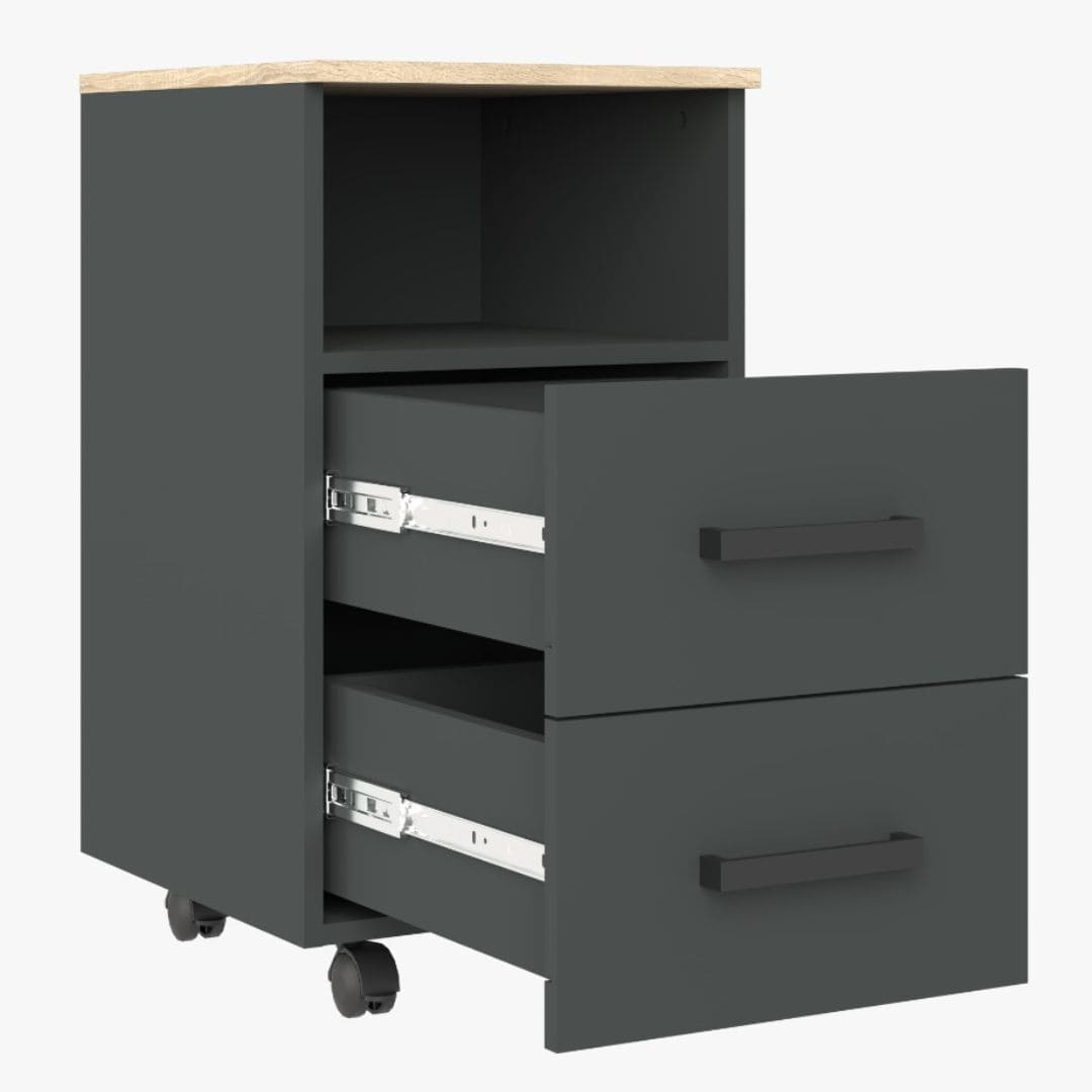 Połączenie ciepłego odcienia dębu sonoma z eleganckim antracytem nadaje komodzie nowoczesny, a jednocześnie ponadczasowy wygląd. Dzięki temu świetnie komponuje się z meblami w stylu skandynawskim, minimalistycznym i industrialnym. Kontenerek z szufladami pod biurko umożliwia wygodne uporządkowanie drobiazgów, dokumentów czy domowych tekstyliów.