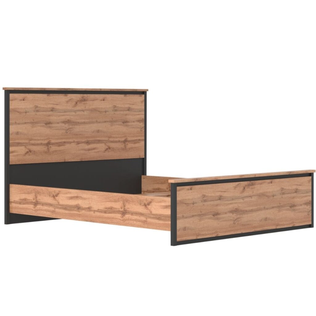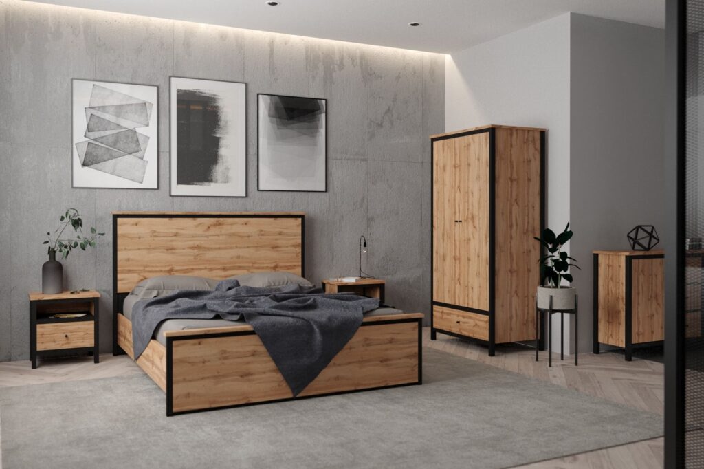Łóżko CHOS w rozmiarze to idealny wybór dla osób szukających mebli funkcjonalnych i stylowych. Nowoczesna forma, wyraziste wykończenie w dekorze dąb tacho oraz matowe, czarne detale sprawiają, że łóżko doskonale wpisuje się w industrialne aranżacje sypialni.
