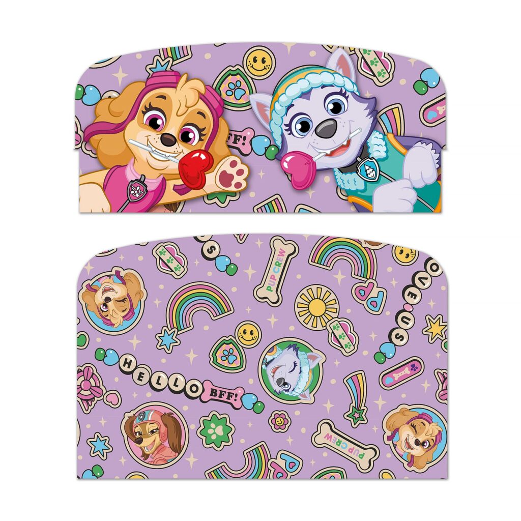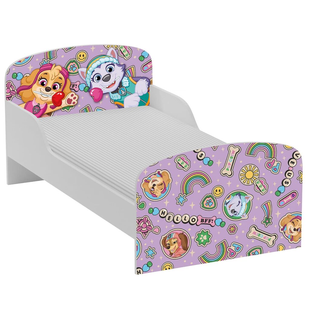 Z przodu i z tyłu łóżka znajdują się kolorowe nadruki przedstawiające Skye i Everest – bohaterów uwielbianej przez dzieci bajki „Psi Patrol”. Zostały one wykonane bezpiecznymi farbami i utrwalone światłem UV, co zapewnia długotrwałość i odporność na blaknięcie.