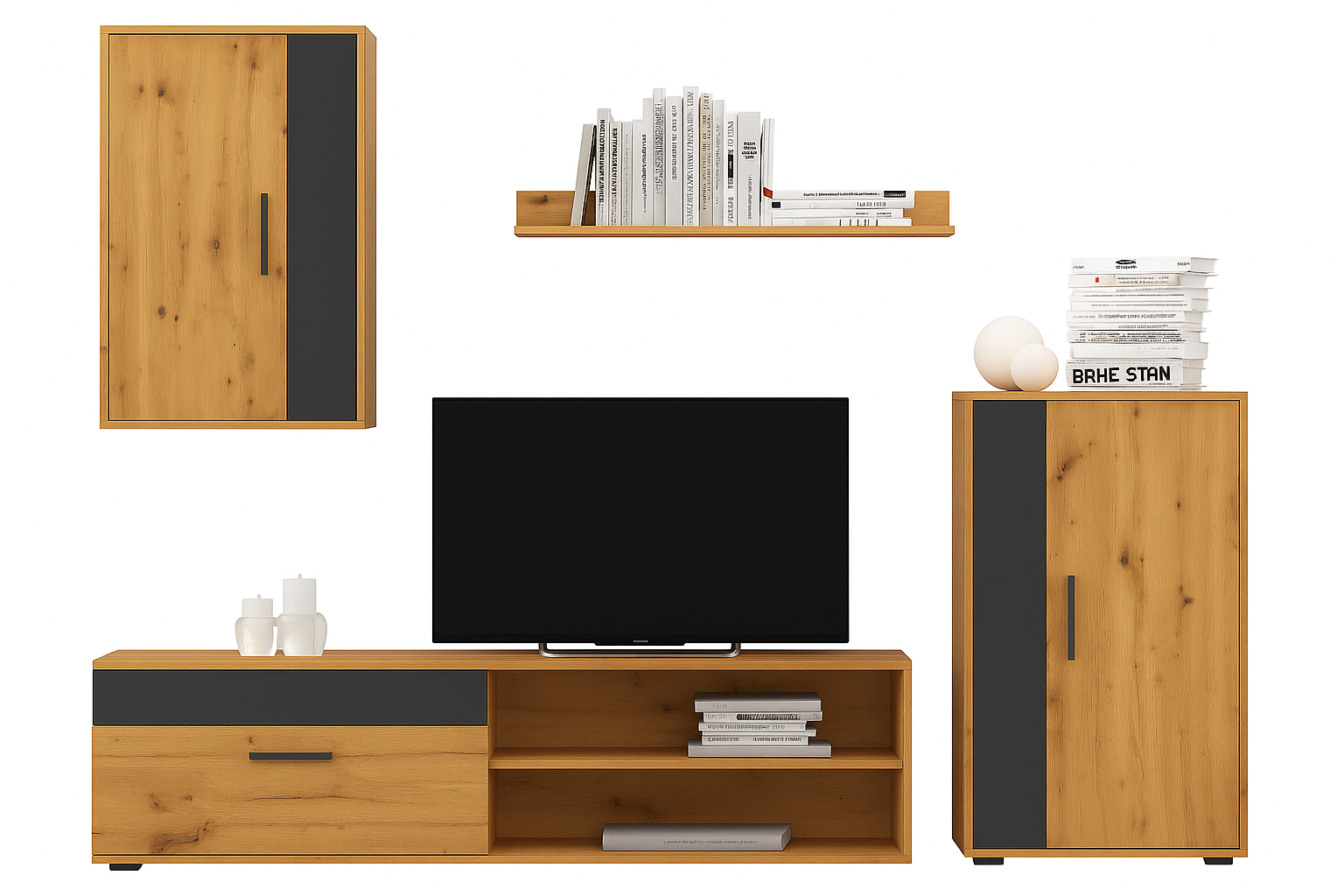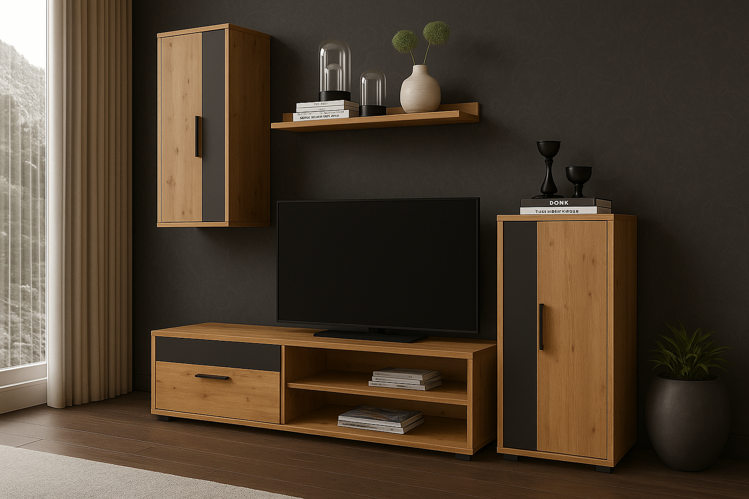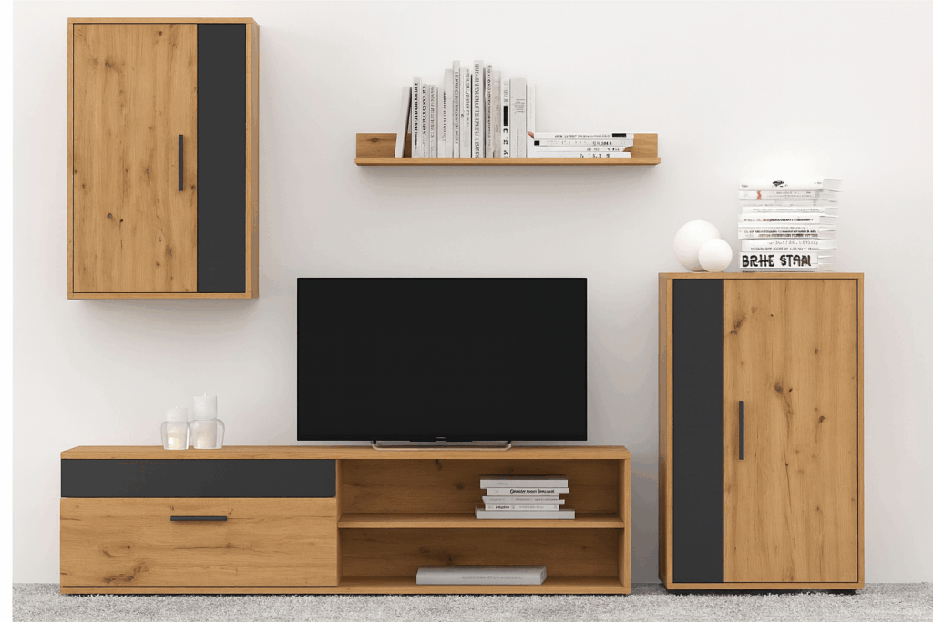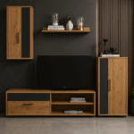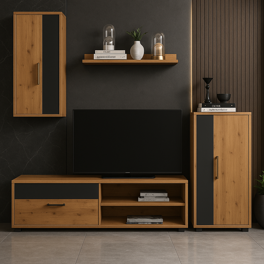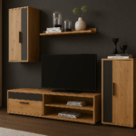 🔹 Kompleksowa Oferta: Zestaw BARATO składa się z czterech kluczowych elementów, które dopełnią każdy salon: szafki RTV idealnej do umieszczenia telewizora, przestronnej komody, funkcjonalnej szafki wiszącej oraz stylowej półki wiszącej.