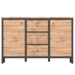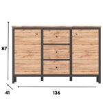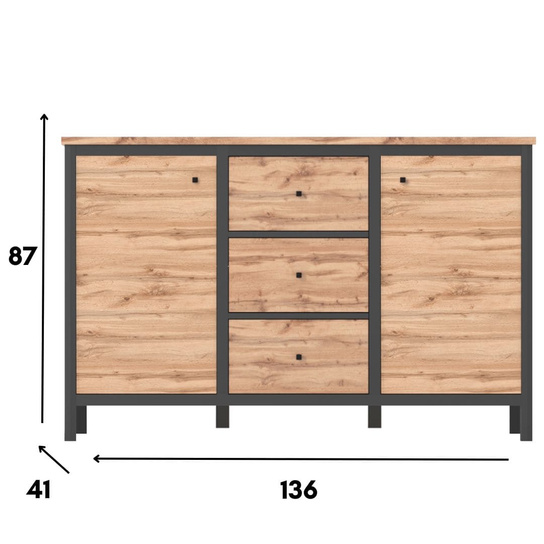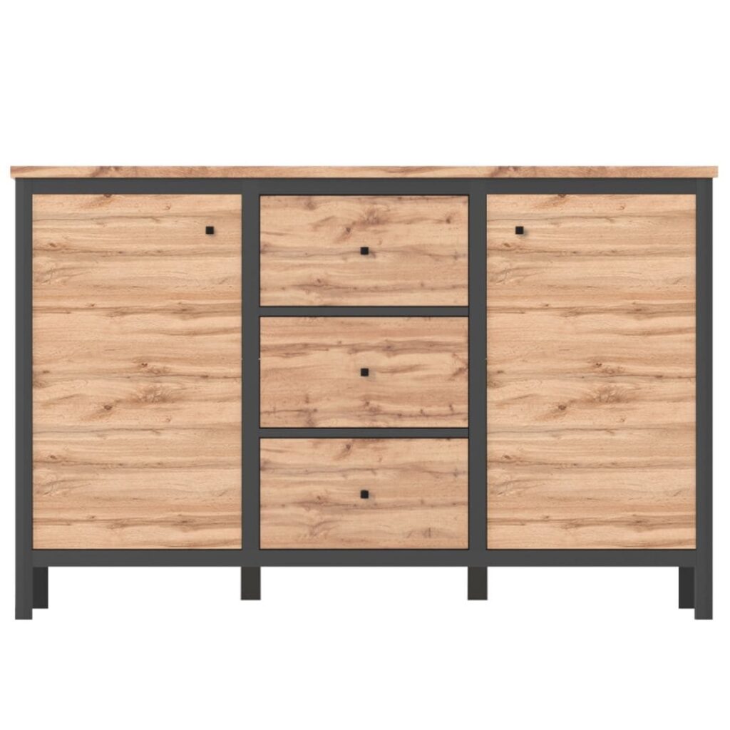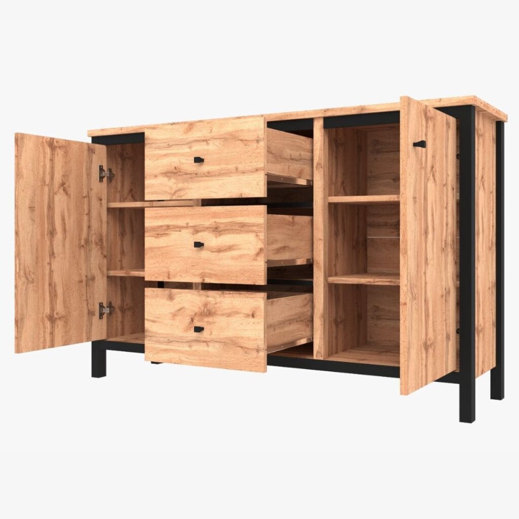 Loftowa komoda CHOS z trzema pojemnymi szufladami i dwoma szafkami to mebel, który zadba o harmonię we wnętrzu – niezależnie, czy ustawisz go w salonie, sypialni, czy przedpokoju. Ciepły odcień dębu tacho pięknie współgra z czernymi wstawkami, tworząc nowoczesny i przytulny efekt. Schowasz tu wszystko, co nie powinno być na widoku – od dokumentów po ubrania. Mebel przyciąga wzrok prostotą formy i subtelnymi, geometrycznymi detalami.