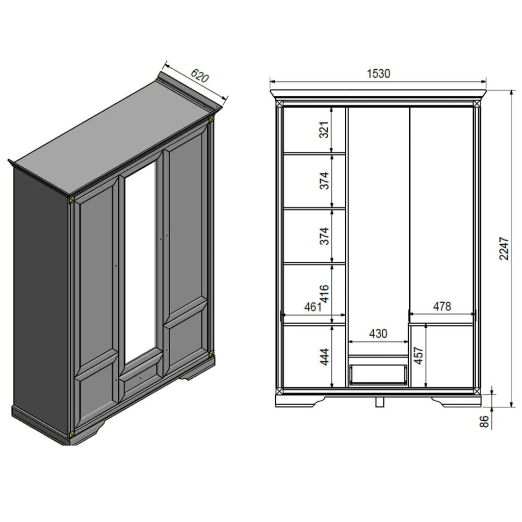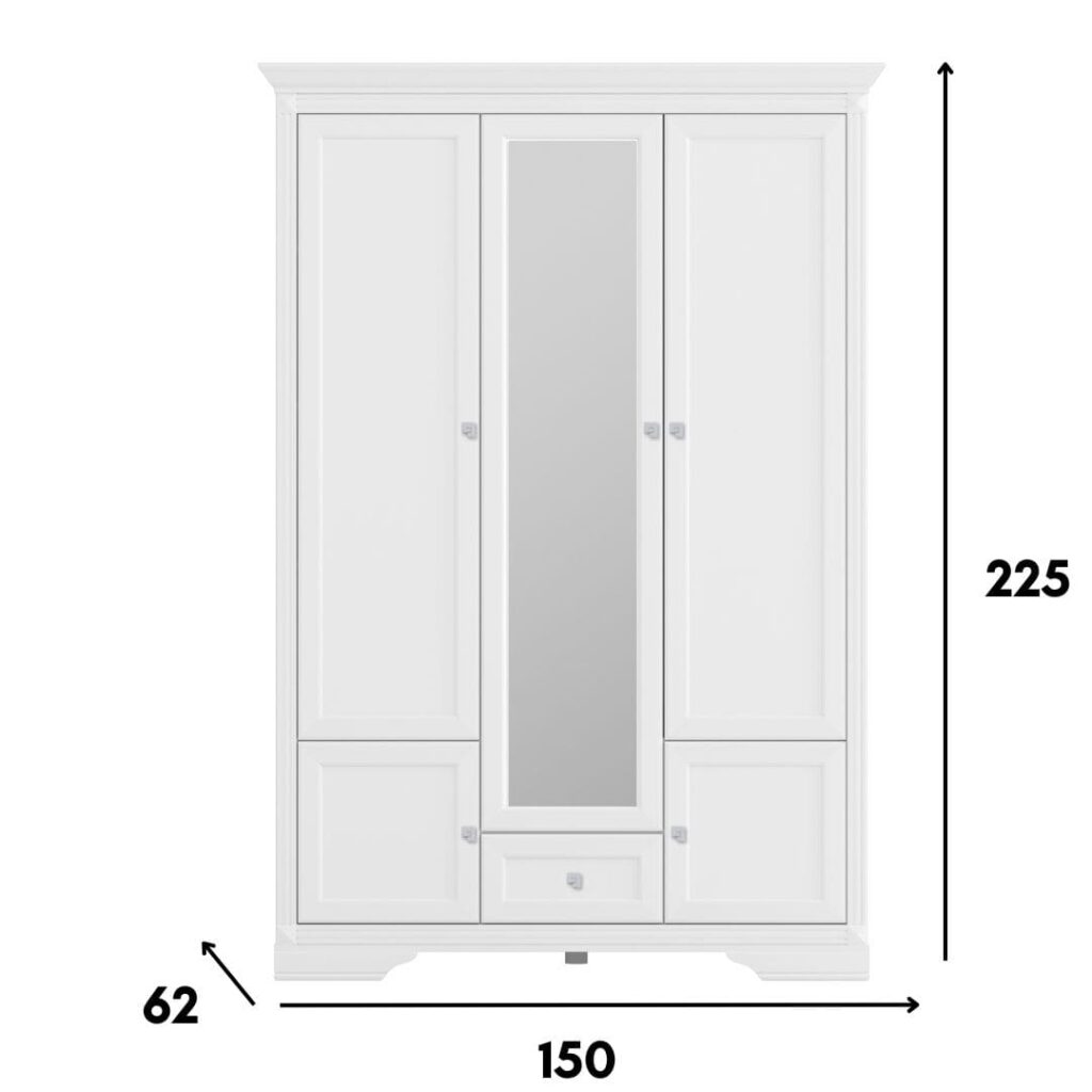 •  szerokość 150 cm, wysokość 225 cm, głębokość 62 cm