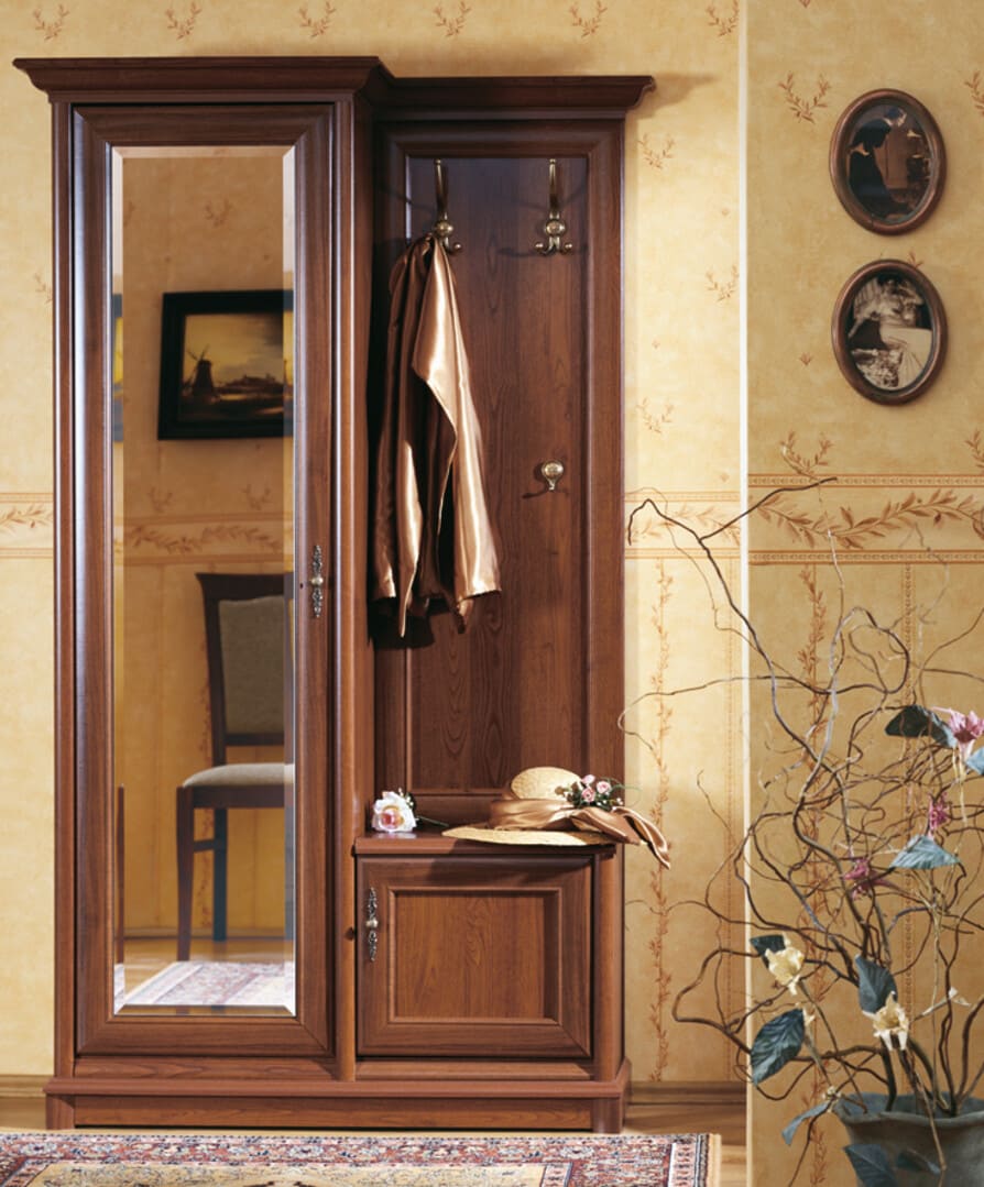 Szafa do przedpokoju z lustrem SONATA idealnie wpisuje się w estetykę mebli klasycznych, które czerpią z tradycyjnych wnętrz. Powierzchnia w głębokim, kasztanowym tonie tworzy eleganiczny akcent już przy wejściu, a subtelne frezowania na frontach podkreślają klasyczne inspiracje. Wbudowane lustro wprowadza światło i wizualną przestrzeń, tworząc wrażenie harmonii znanej z dawnych holi.