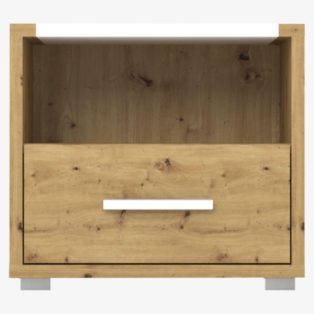 Szafka nocna AMBER zachwyca prostotą. Jej niewielka forma skrywa praktyczną półkę i szufladę, które pomagają zachować porządek przy łóżku. Jasny odcień dębu artisan współgra z każdym wnętrzem, wprowadzając przyjemne wrażenie ciepła i spokoju.