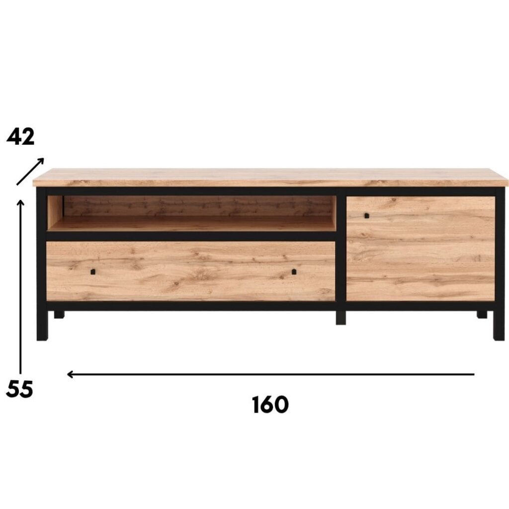 Szafka RTV w dekorze dąb tacho doskonale wpisuje się w aranżacje loftowe i nowoczesne, wprowadzając do wnętrza ciepło naturalnego drewna i charakterystyczny industrialny akcent dzięki czarnym, matowym elementom.