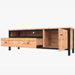 Wyposażona w otwarte półki szafka umożliwia łatwy dostęp do sprzętu multimedialnego, takiego jak odtwarzacze czy konsole, a dodatkowe zamykane szafki pomogą zachować porządek, chowając kable, piloty i drobne akcesoria.