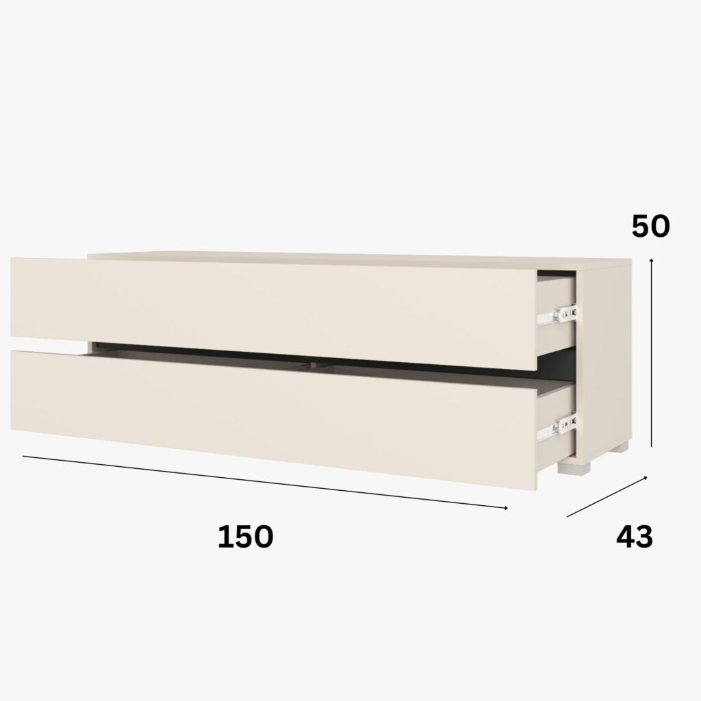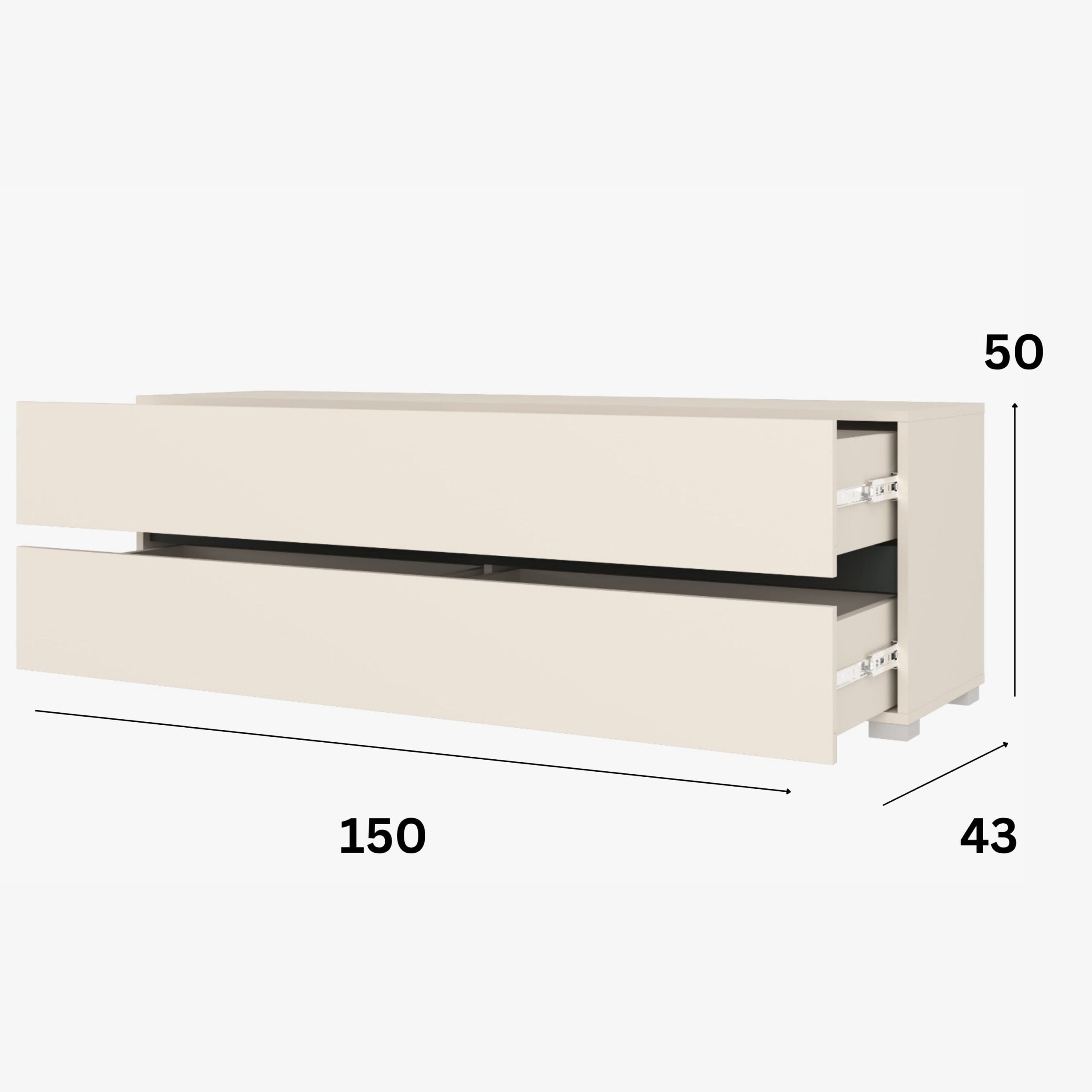 Dwie pojemne szuflady pozwalają na estetyczne przechowanie kabli, pilotów i innych drobnych akcesoriów. Przemyślana forma zapewnia stabilne miejsce dla telewizora oraz sprzętów elektronicznych, dbając jednocześnie o wizualny porządek w strefie relaksu.