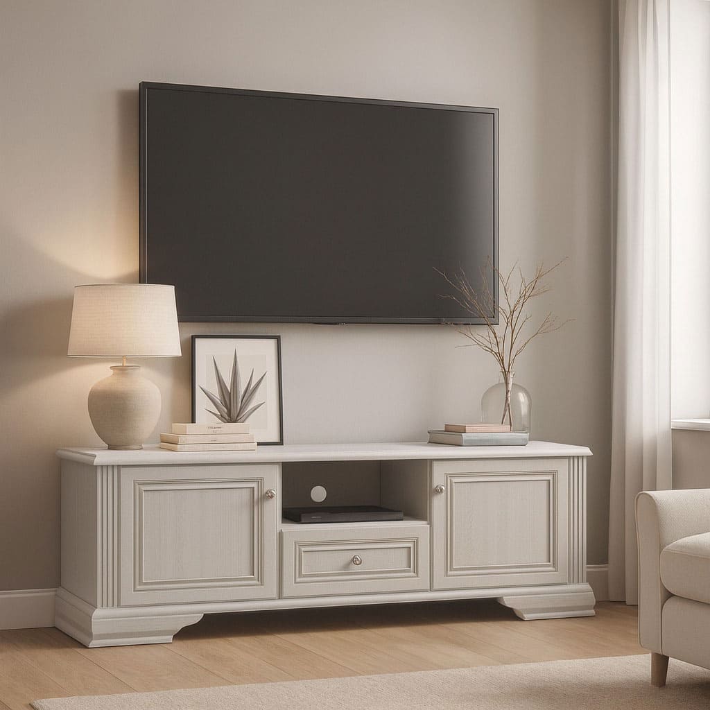 Przemyślany układ szafek i otwartych półek pozwala wygodnie rozmieścić sprzęt multimedialny, akcesoria czy kolekcję płyt. Harmonijne proporcje i starannie dobrane detale sprawiają, że szafka pełni rolę nie tylko praktycznego mebla, ale także eleganckiego dopełnienia wystroju.