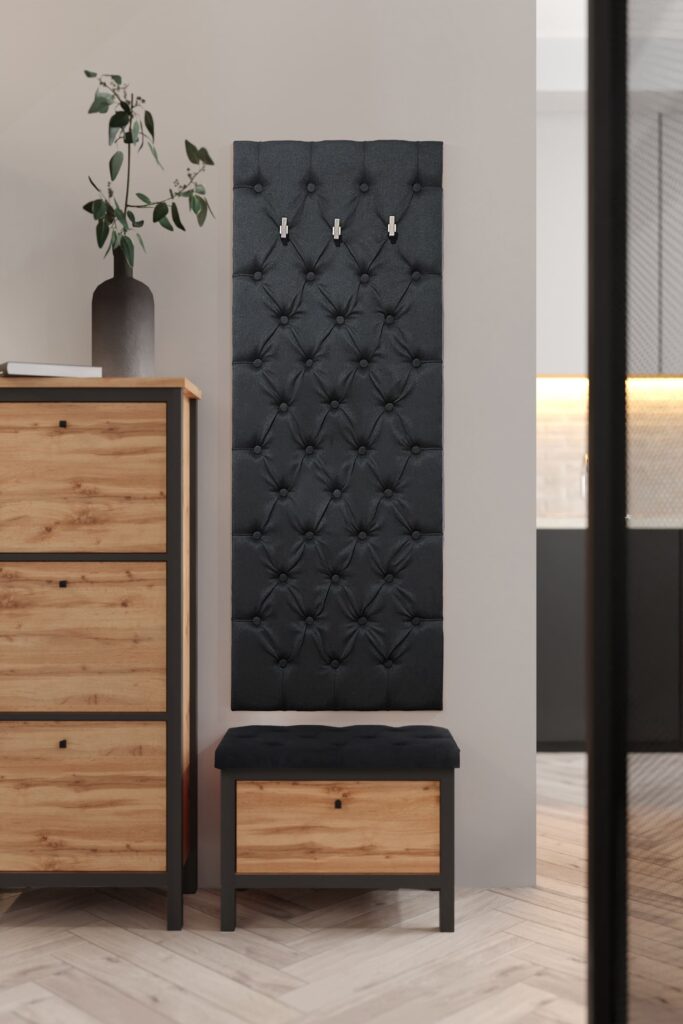 Szafka CHOS to praktyczny mebel, który świetnie sprawdzi się w przedpokoju jako miejsce do przechowywania butów oraz wygodne siedzisko. Zamykania przestrzeń może pomieścić również codzienne drobiazgi, a stabilna konstrukcja pozwala na komfortowe użytkowanie na co dzień. Kontrastujące wykończenie w dębie tacho i czarnym macie nadaje jej nowoczesny, loftowy charakter – idealny do współczesnych wnętrz.