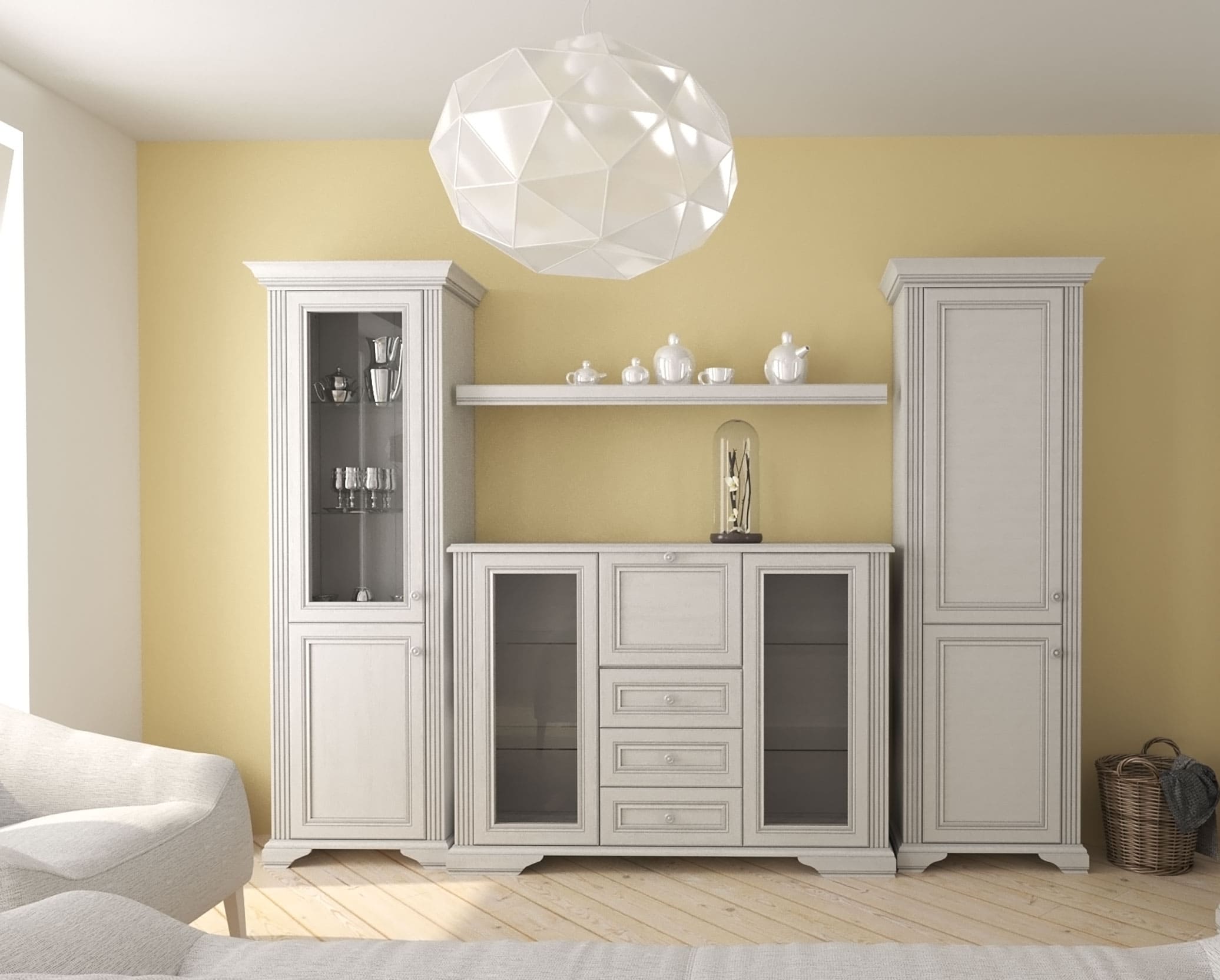 Witryna WINDSOR została zaprojektowana tak, by jednocześnie porządkować codzienność i subtelnie zdobić pomieszczenie. Subtelne detale, takie jak pionowe podziały, frezowane fronty i dekor sosny śnieżnej, nadają całości ponadczasowego charakteru. Mebel doskonale komponuje się z innymi elementami kolekcji WINDSOR, tworząc spójny wystrój w jadalni czy salonie. To witryna, który wnosi do wnętrza porządek, elegancję i delikatną nutę luksusu.