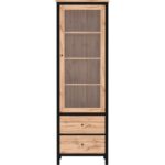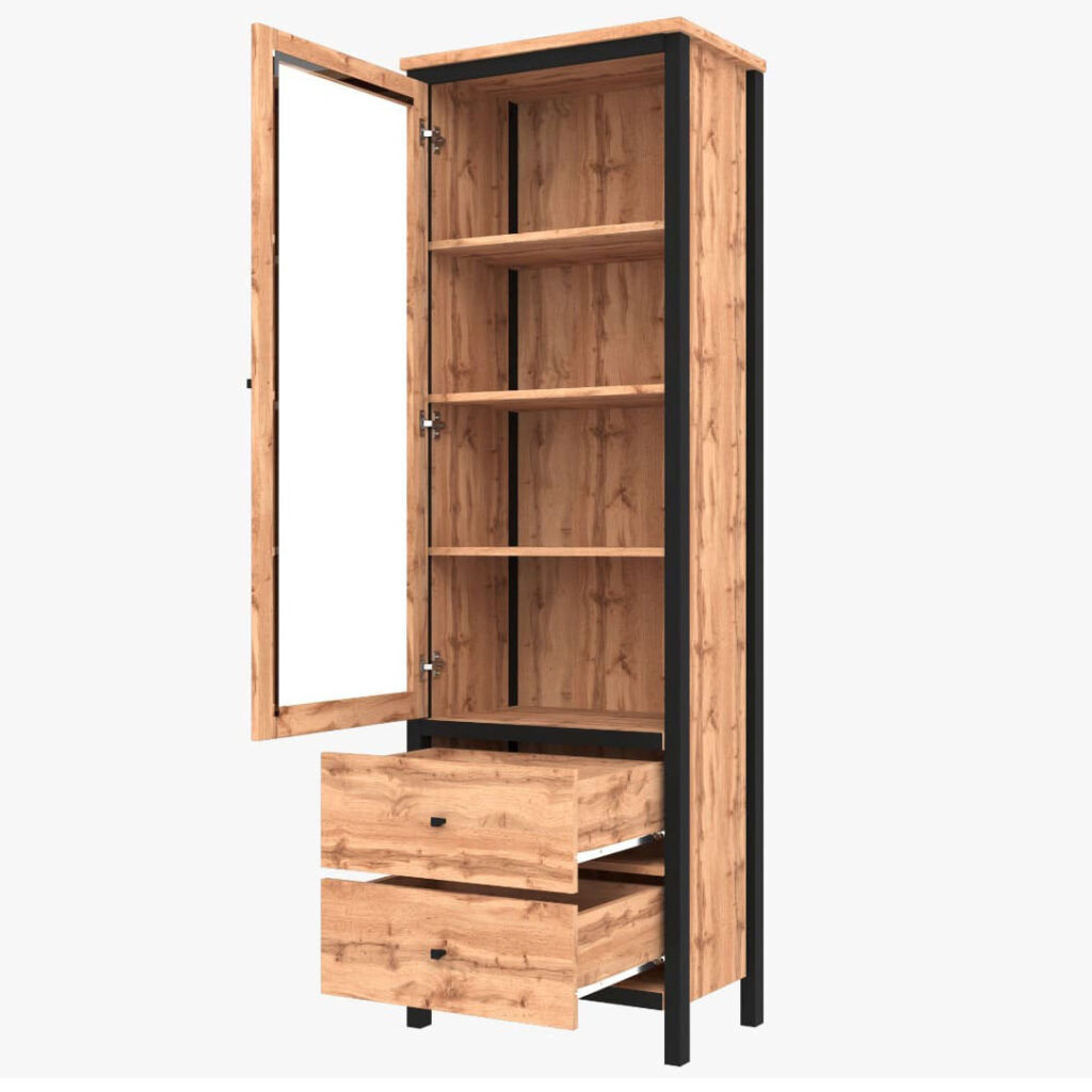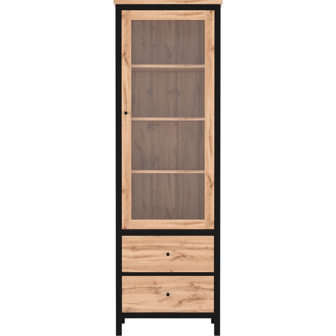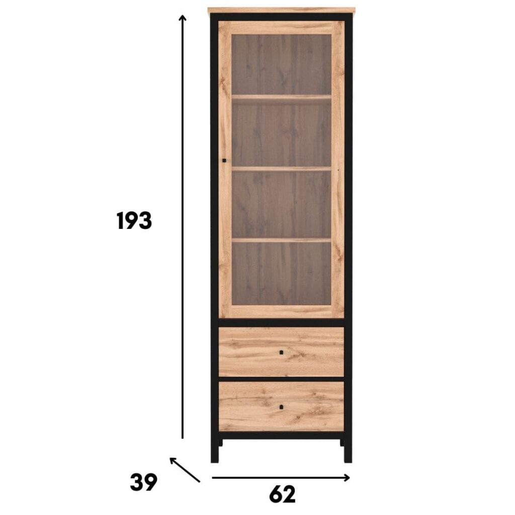 Witryna CHOS to propozycja dla tych, którzy cenią porządek, ale nie chcą rezygnować z dekoracyjnego charakteru wnętrza. Przeszklona część mebla pozwoli Ci wyeksponować ulubione książki, pamiątki z podróży lub ceramikę, a w dwóch pojemnych szufladach schowasz to, co powinno pozostać poza zasięgiem wzroku. Zestawienie ciepłego dekoru dąb tacho z czarnymi detalami dodaje całości loftowego charakteru i dobrze współgra zarówno z nowoczesnymi aranżacjami, jak i bardziej przytulnymi przestrzeniami. To mebel, który łączy funkcję estetyczną z użytkową – bez zbędnego przepychu.