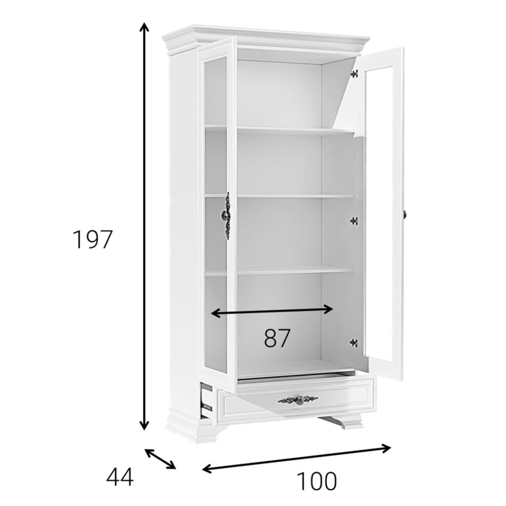 Dopracowane detale, takie jak frezowania i uchwyty, tworzą spójną kompozycję. Witryna WERSAL doskonale sprawdzi się w salonie, jako miejsce ekspozycji dekoracji, oraz w jadalni, gdzie stanie się eleganckim elementem podkreślającym rangę wspólnych posiłków. To propozycja dla osób, które poszukują połączenia estetyki białych mebli prowansalskich z praktycznym zastosowaniem w codziennym wnętrzu.