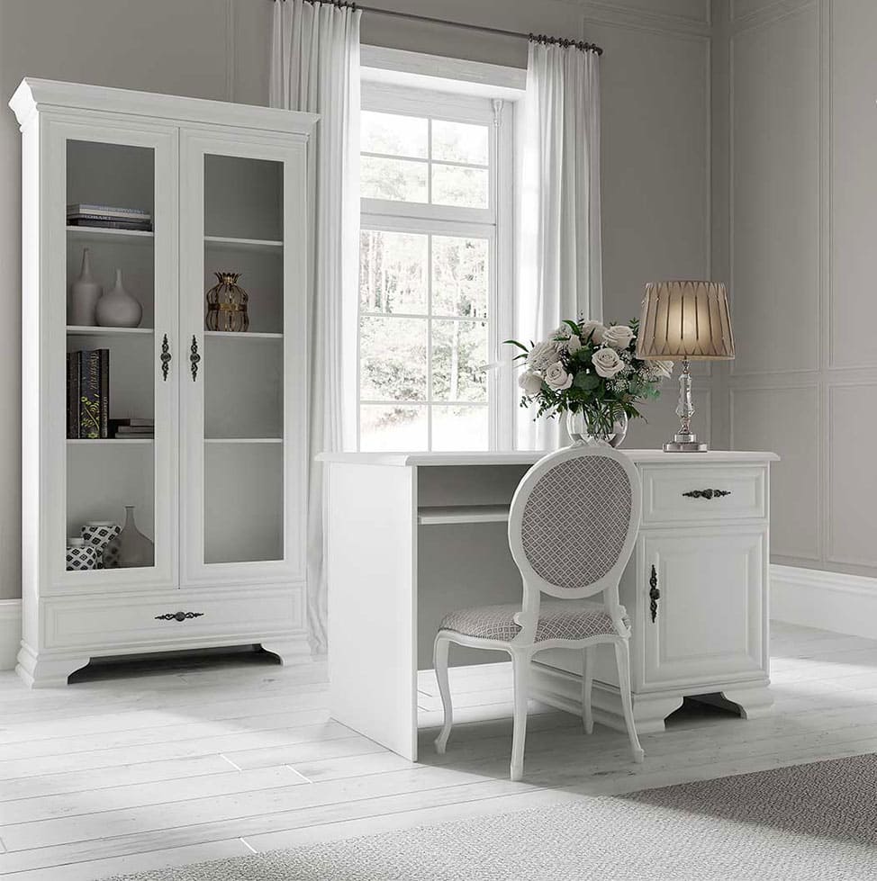 Witryna z kolekcji WERSAL to połączenie subtelnej elegancji i prowansalskiego charakteru. Przeszklony front pozwala wyeksponować porcelanę, szkło, książki czy dekoracje, podkreślając klasyczny charakter białych mebli prowansalskich.
