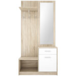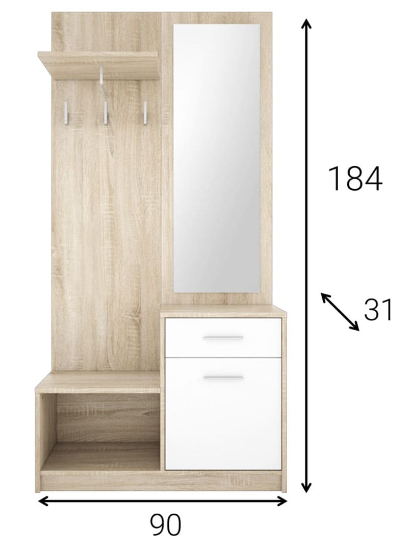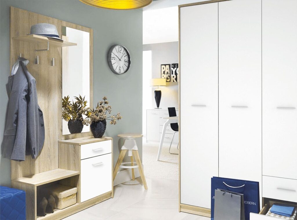 Wieszak, lustro oraz zamknięta szafka tworzą funkcjonalny układ, charakterystyczny dla mebli do przedpokoju sonoma biały. Dolna część pełni rolę praktycznego miejsca na obuwie, a siedzisko ułatwia codzienny rytuał zdejmowania płaszcza czy butów. Taki zestaw do przedpokoju z lustrem sprawdza się zwłaszcza tam, gdzie liczy się każdy metr i wizualna lekkość.